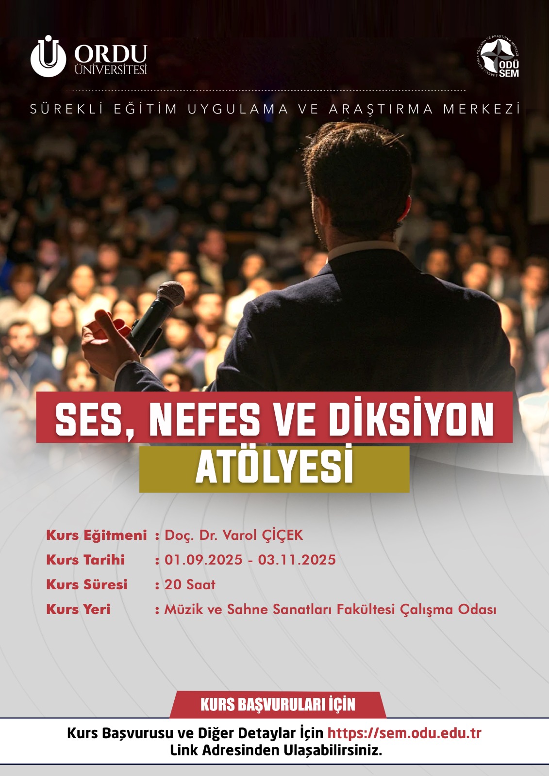Sürekli Eğitim Uygulama ve Araştırma Merkezi Müdürlüğümüzce, Üniversitemiz Müzik ve Sahne Sanatları Fakültesi akademisyenlerinden Doç. Dr. Varol ÇİÇEK'in eğitmenliğinde "Ses Nefes ve Diksiyon Atölyesi" kursu eğitimi verilecektir. İlgilenenler, kurs başvurusu yapmak için https://odusem.odu.edu.tr/index/kurs_bilgi/150 sayfasını ziyaret edebilirler.