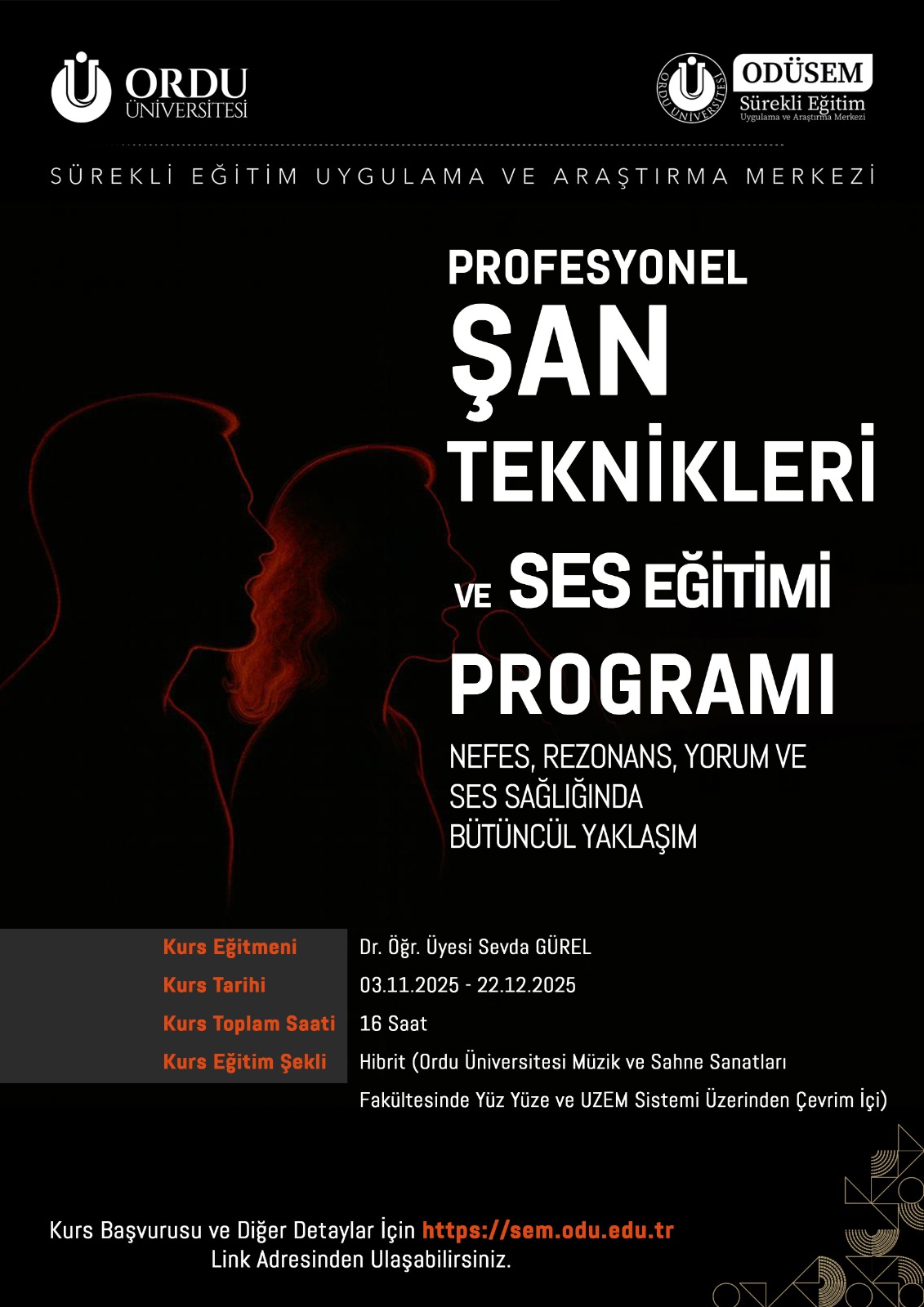 Sürekli Eğitim Uygulama ve Araştırma Merkezi Müdürlüğümüzce, Üniversitemiz Müzik ve Sahne Sanatları Fakültesi akademisyenlerinden Dr. Öğretim Üyesi Sevda GÜREL'in eğitmenliğinde "Profesyonel Şan Teknikleri ve Ses Eğitimi Programı: Nefes, Rezonans, Yorum ve Ses Sağlığında Bütüncül Yaklaşım" kursu eğitimi verilecektir. İlgilenenler, kurs başvurusu yapmak için https://odusem.odu.edu.tr/index/kurs_bilgi/152 sayfasını ziyaret edebilirler.