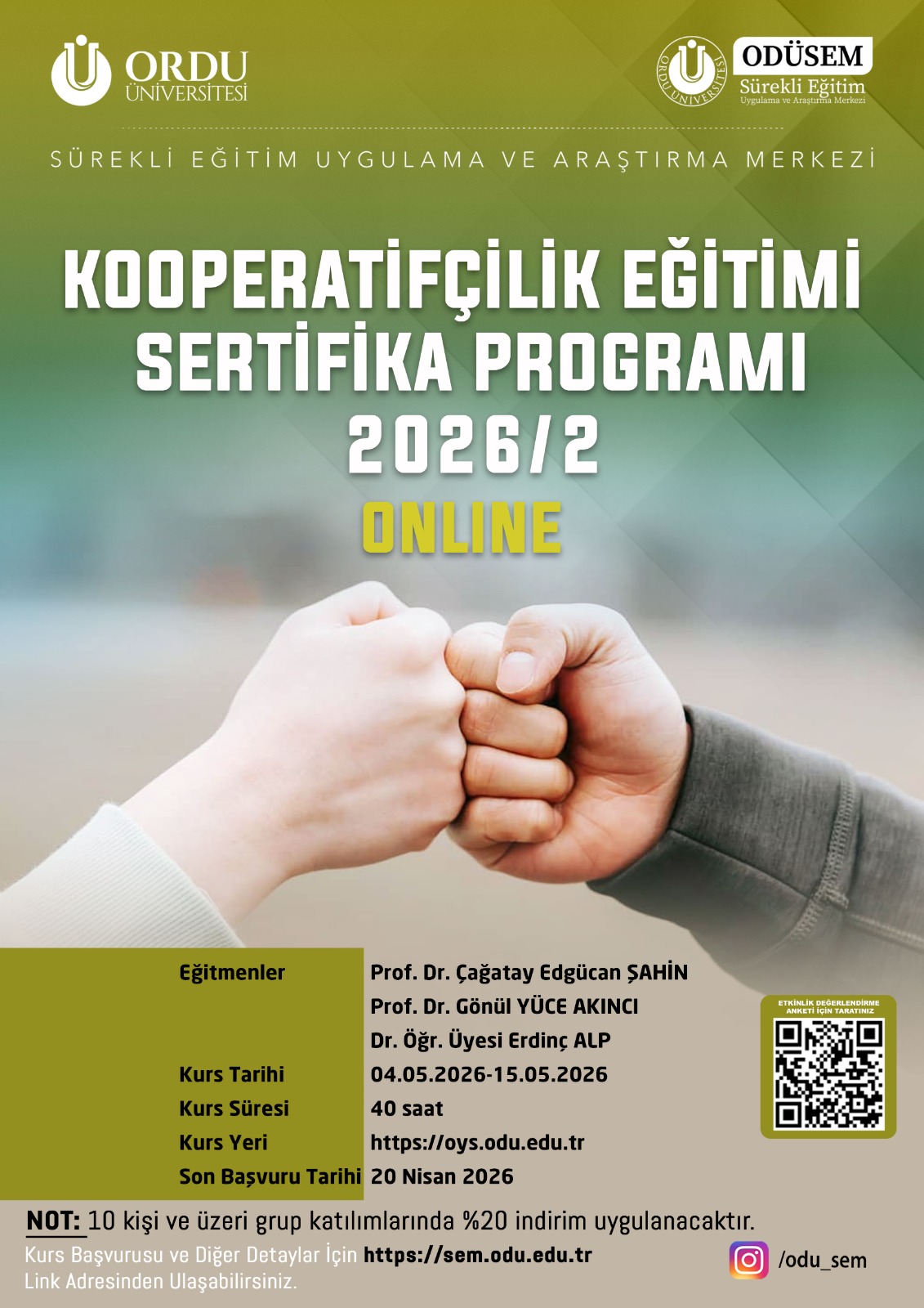 Sürekli Eğitim Uygulama ve Araştırma Merkezi Müdürlüğümüzce yürütülecek olan "Kooperatifçilik Eğitimi Sertifika Programı 2026/2" kursuna başvurusu yapmak için https://odusem.odu.edu.tr/index/kurs_bilgi/159 sayfasını ziyaret ediniz.